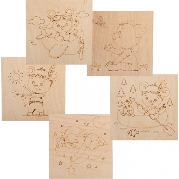 - 5 досок для выжигания — сюжеты с мишкой (мишка на каноэ, мишка летчик, мишка индеец, мишка соня, мишка с бабочкой).
