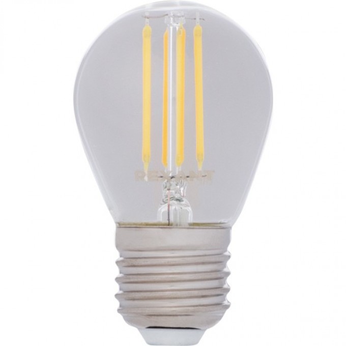 Филаментная прозрачная лампа REXANT GL45 в форме шара мощностью 7.5Вт с цоколем E27 и с теплым белым свечением в 2700K прекрасно подходит для дизайнерского освещения комнат, домов, гостиниц, кафе, и других объектов.