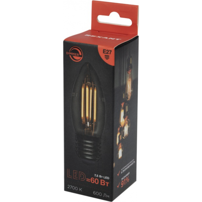 Лампа филаментная REXANT Свеча CN35 7,5Вт 600Лм 2700K E27 прозрачная колба 604-085