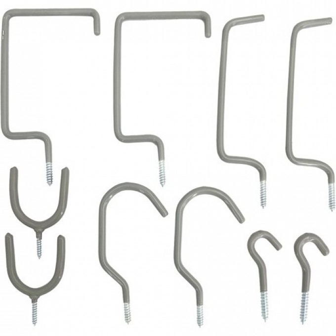 Набор состоит из десяти крюков различных форм, которые используются для фиксации предметов или конструкций на стенах или потолках.