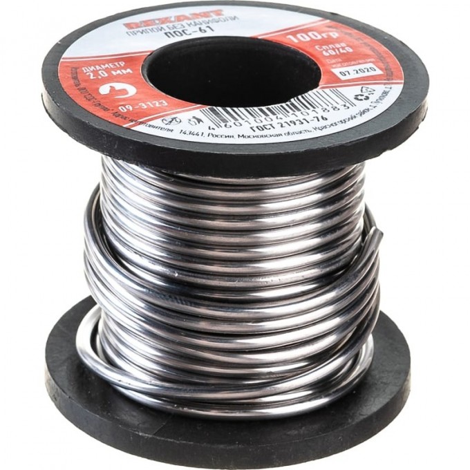 Припой без канифоли REXANT ПОС-61, 100 г, Ø2,0 мм, (олово 61%, свинец 39%), катушка 09-3123