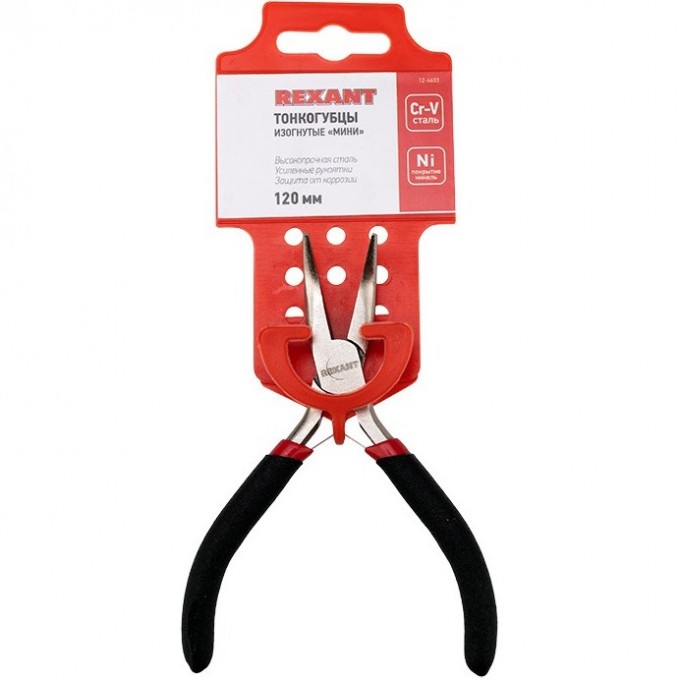 Тонкогубцы изогнутые REXANT мини 120 мм никелированные, авторазжим, обливные рукоятки 12-4603